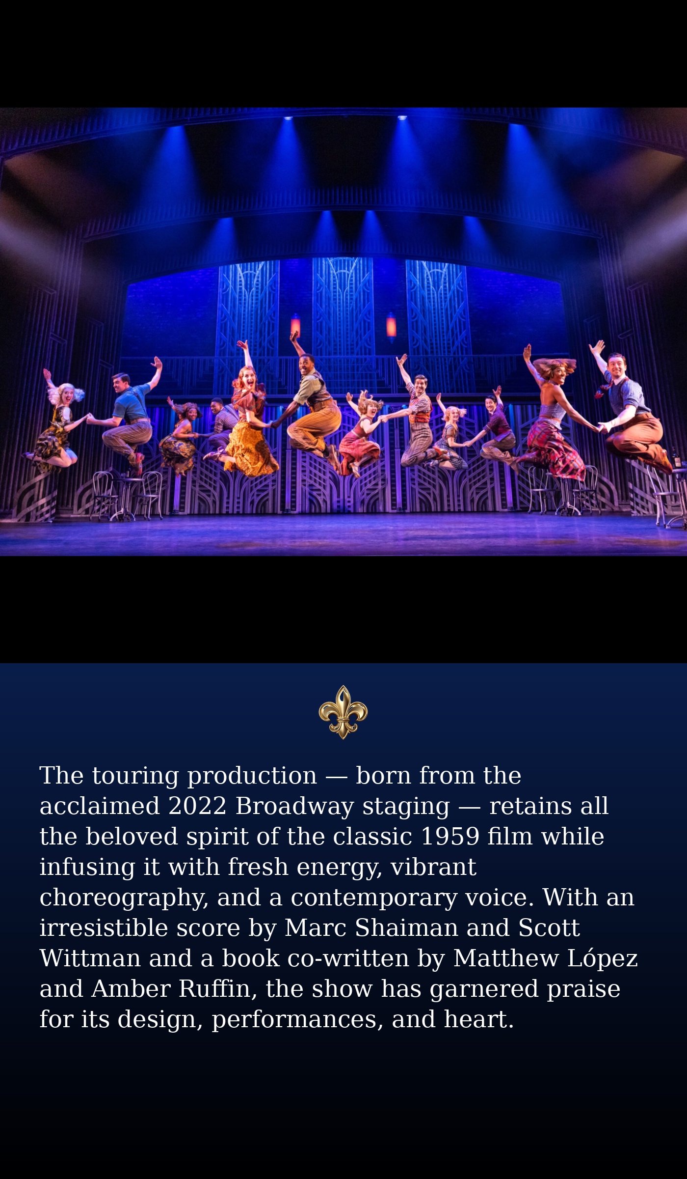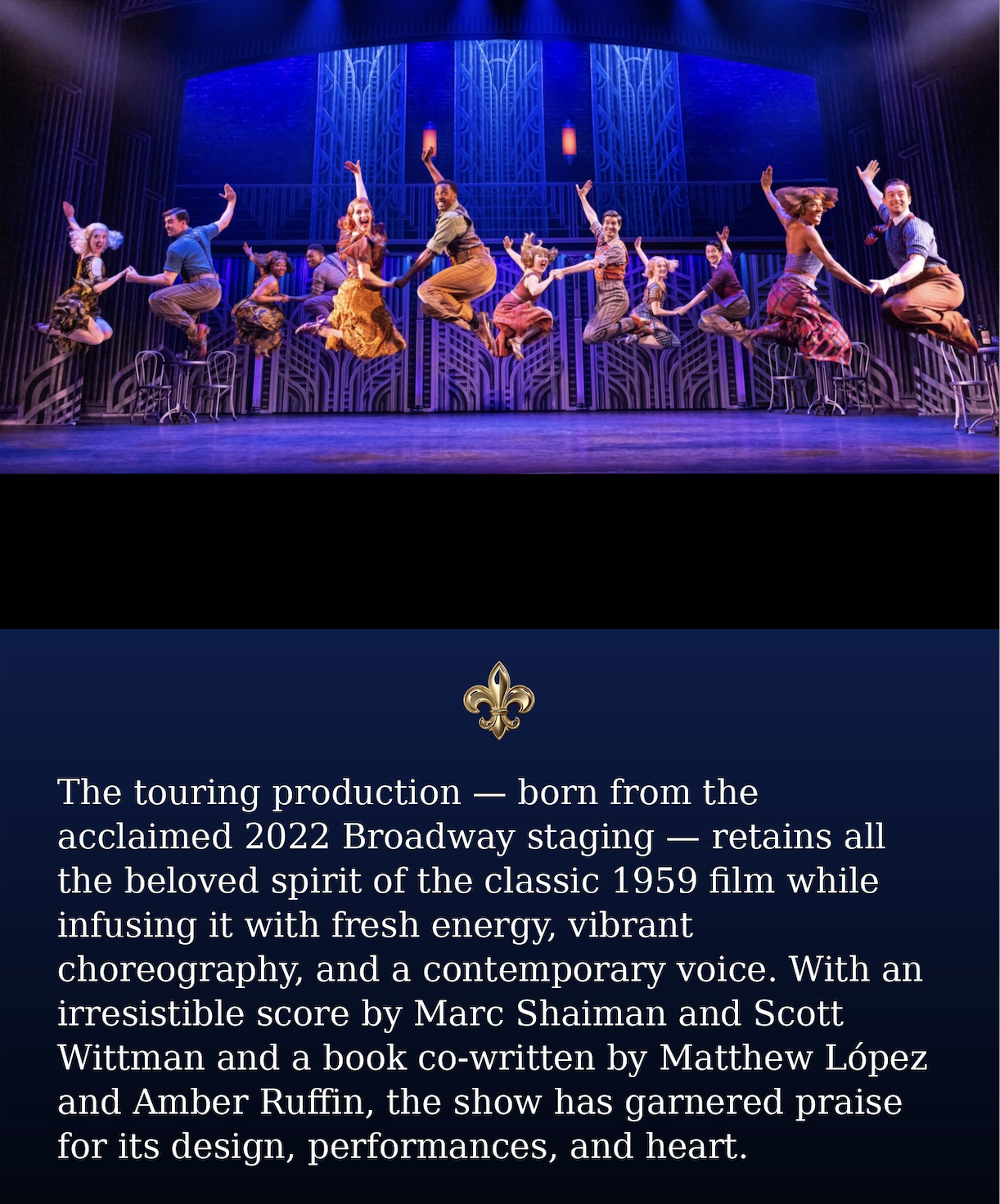 The touring production — born from the acclaimed 2022 Broadway staging — retains all the beloved spirit of the classic 1959 film while infusing it with fresh energy, vibrant choreography, and a contemporary voice. With an irresistible score by Marc Shaiman and Scott Wittman and a book co-written by Matthew López and Amber Ruffin, the show has garnered praise for its design, performances, and heart.