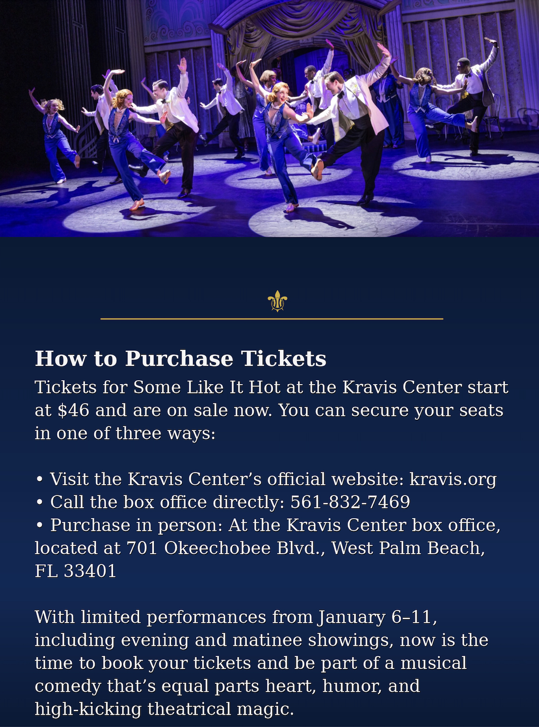 Tickets for Some Like It Hot at the Kravis Center start at $46 and are on sale now. You can secure your seats in one of three ways: