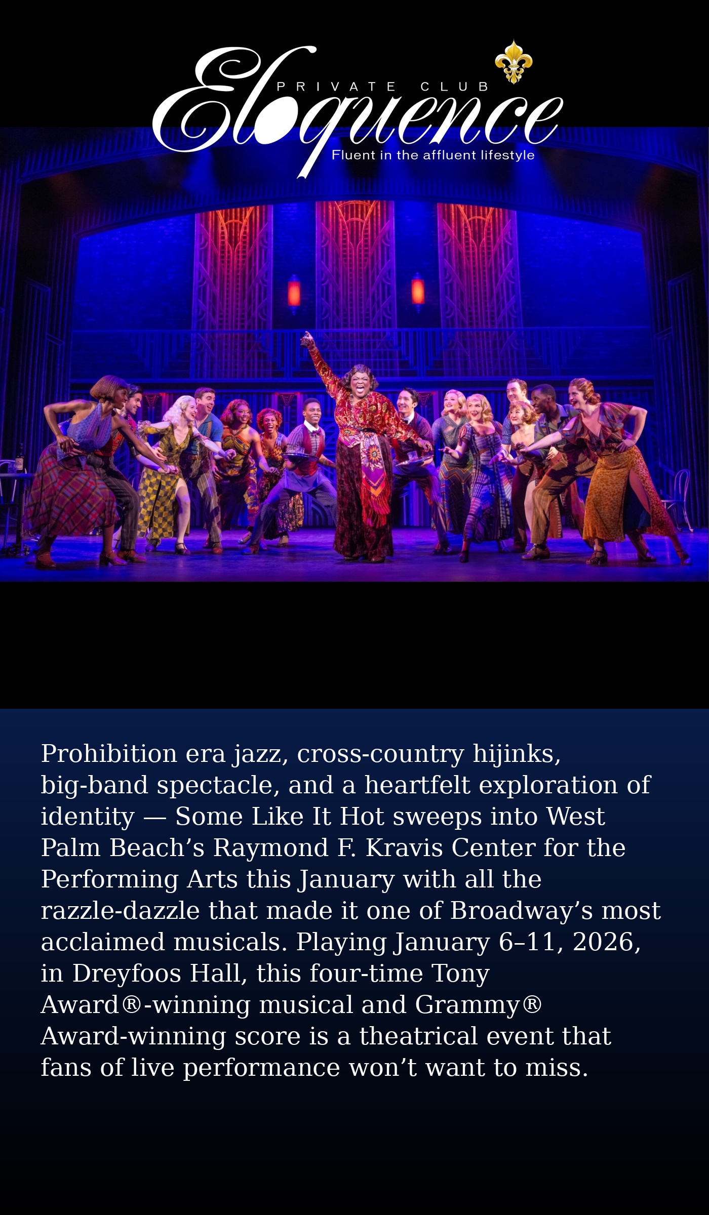 Prohibition era jazz, cross-country hijinks, big-band spectacle, and a heartfelt exploration of identity — Some Like It Hot sweeps into West Palm Beach’s Raymond F. Kravis Center for the Performing Arts this January with all the razzle-dazzle that made it one of Broadway’s most acclaimed musicals. Playing January 6–11, 2026, in Dreyfoos Hall, this four-time Tony Award®-winning musical and Grammy® Award-winning score is a theatrical event that fans of live performance won’t want to miss.