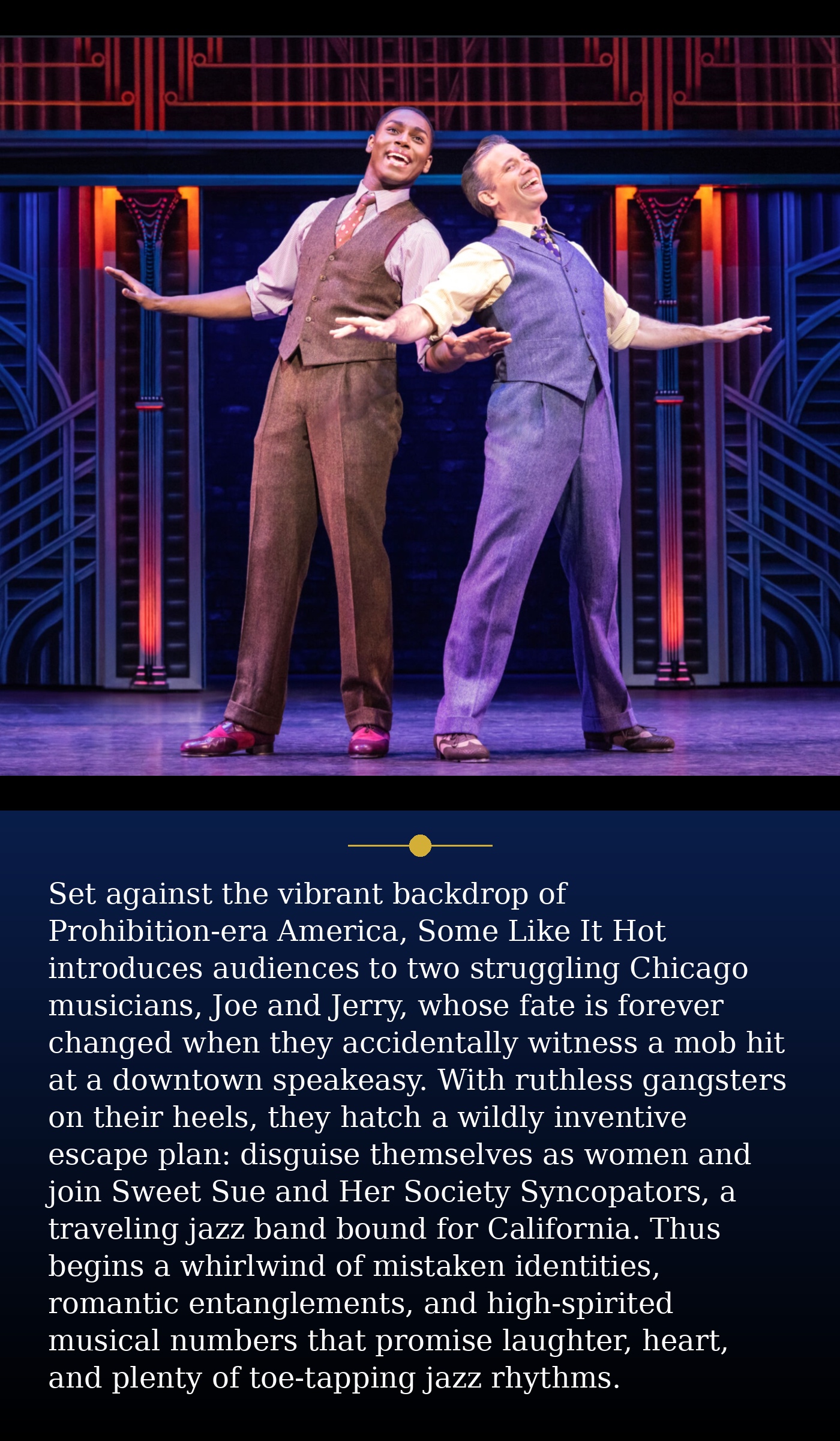 Set against the vibrant backdrop of Prohibition-era America, Some Like It Hot introduces audiences to two struggling Chicago musicians, Joe and Jerry, whose fate is forever changed when they accidentally witness a mob hit at a downtown speakeasy. With ruthless gangsters on their heels, they hatch a wildly inventive escape plan: disguise themselves as women and join Sweet Sue and Her Society Syncopators, a traveling jazz band bound for California. Thus begins a whirlwind of mistaken identities, romantic entanglements, and high-spirited musical numbers that promise laughter, heart, and plenty of toe-tapping jazz rhythms.