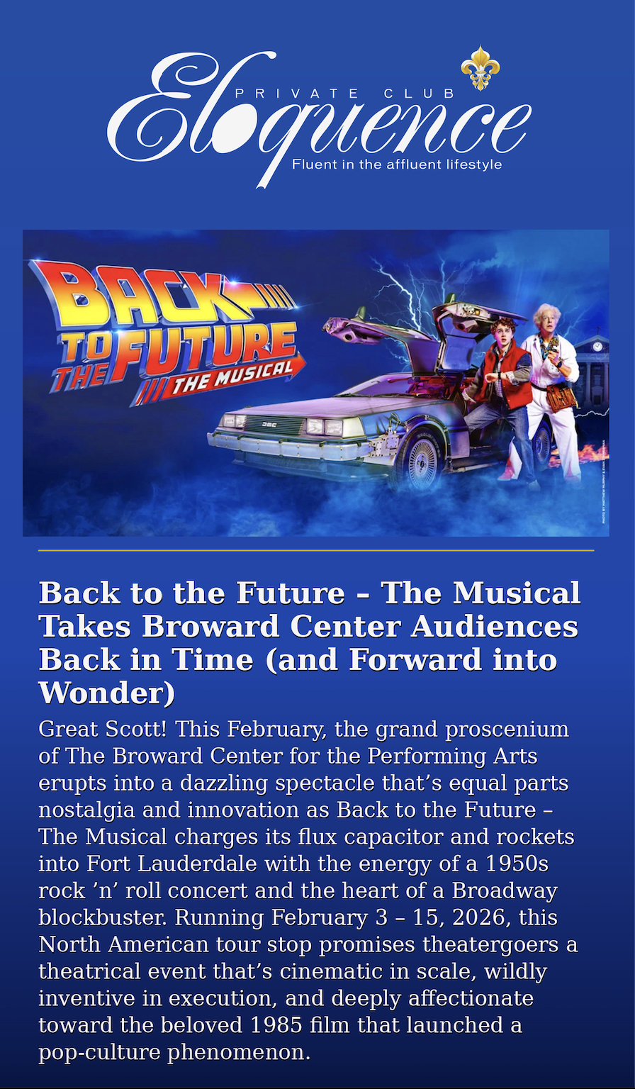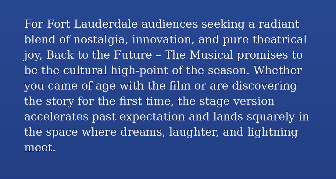 For Fort Lauderdale audiences seeking a radiant blend of nostalgia, innovation, and pure theatrical joy, Back to the Future – The Musical promises to be the cultural high-point of the season. Whether you came of age with the film or are discovering the story for the first time, the stage version accelerates past expectation and lands squarely in the space where dreams, laughter, and lightning meet.