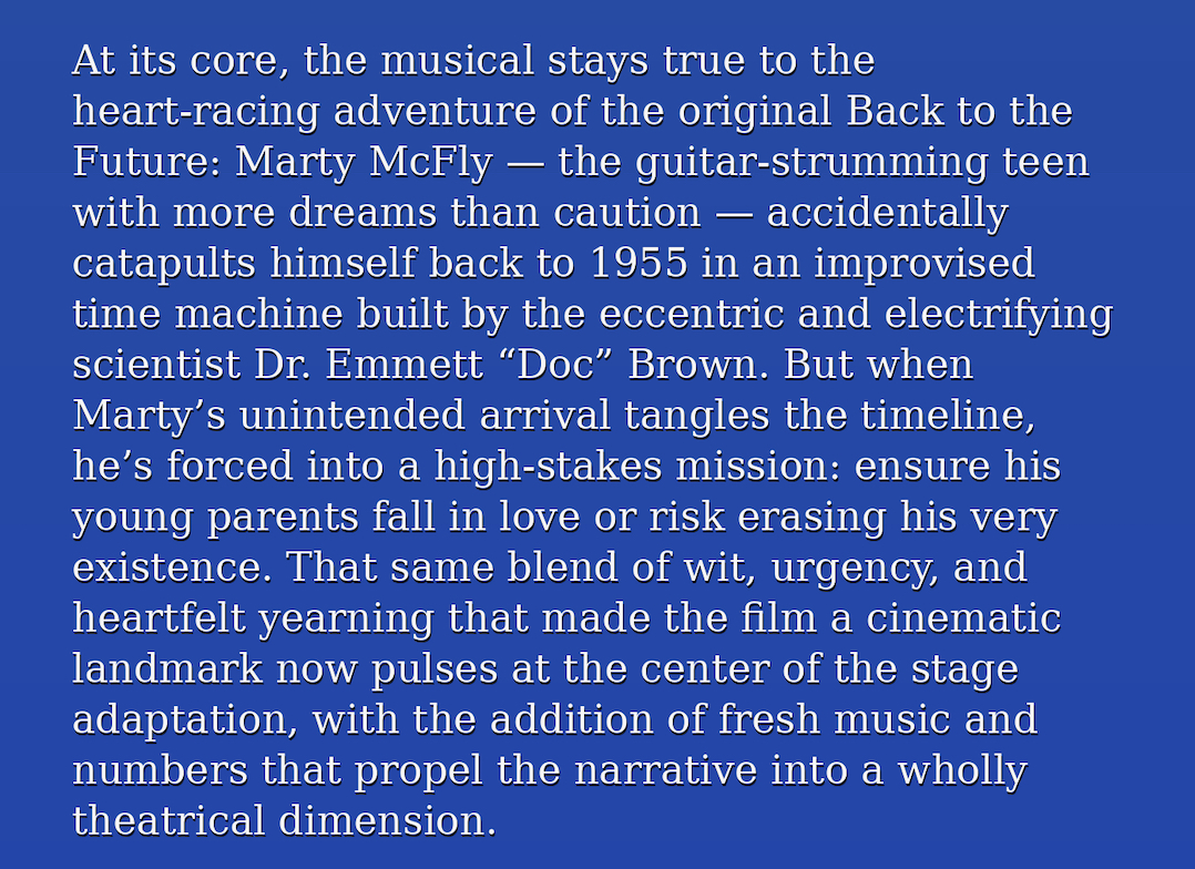 At its core, the musical stays true to the heart-racing adventure of the original Back to the Future: Marty McFly — the guitar-strumming teen with more dreams than caution — accidentally catapults himself back to 1955 in an improvised time machine built by the eccentric and electrifying scientist Dr. Emmett “Doc” Brown. But when Marty’s unintended arrival tangles the timeline, he’s forced into a high-stakes mission: ensure his young parents fall in love or risk erasing his very existence. That same blend of wit, urgency, and heartfelt yearning that made the film a cinematic landmark now pulses at the center of the stage adaptation, with the addition of fresh music and numbers that propel the narrative into a wholly theatrical dimension.