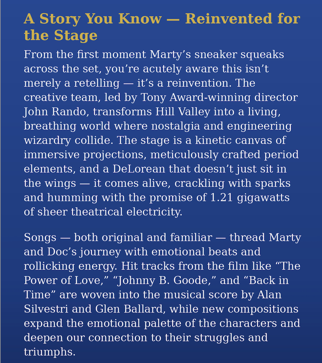 Songs — both original and familiar — thread Marty and Doc’s journey with emotional beats and rollicking energy. Hit tracks from the film like “The Power of Love,” “Johnny B. Goode,” and “Back in Time” are woven into the musical score by Alan Silvestri and Glen Ballard, while new compositions expand the emotional palette of the characters and deepen our connection to their struggles and triumphs.