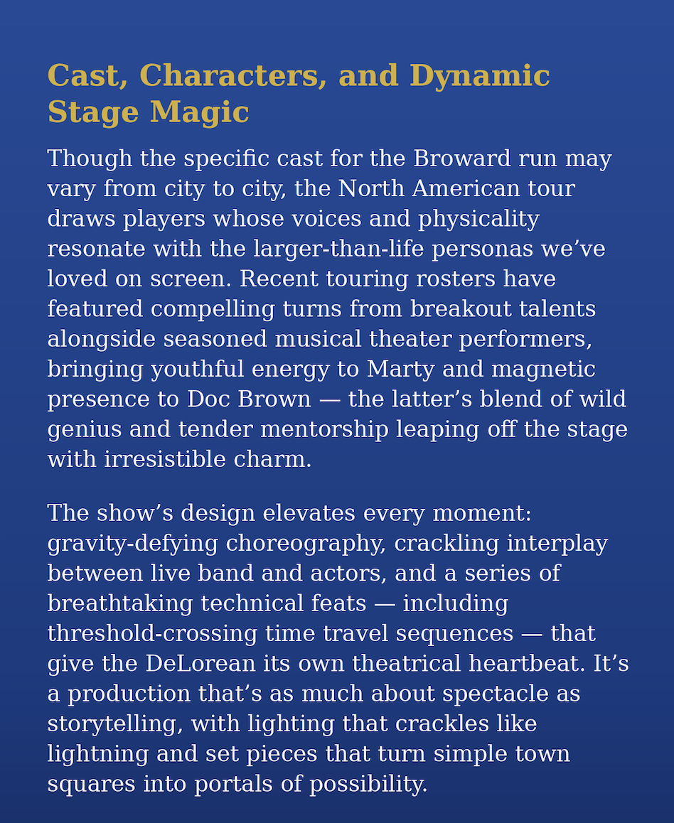 Though the specific cast for the Broward run may vary from city to city, the North American tour draws players whose voices and physicality resonate with the larger-than-life personas we’ve loved on screen. Recent touring rosters have featured compelling turns from breakout talents alongside seasoned musical theater performers, bringing youthful energy to Marty and magnetic presence to Doc Brown — the latter’s blend of wild genius and tender mentorship leaping off the stage with irresistible charm.