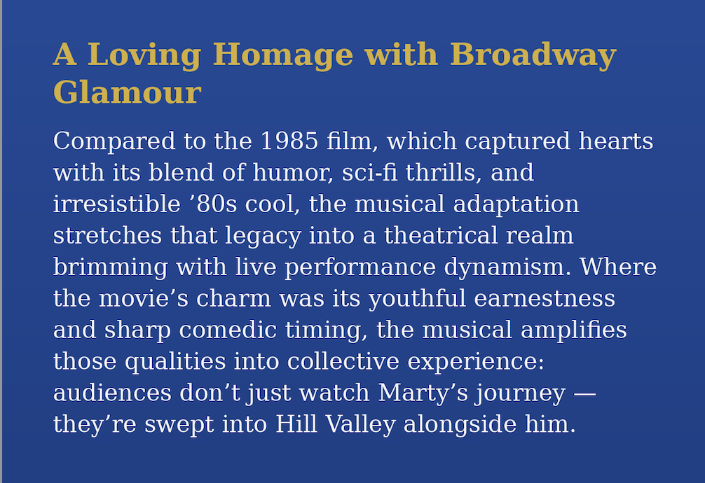 Compared to the 1985 film, which captured hearts with its blend of humor, sci-fi thrills, and irresistible ’80s cool, the musical adaptation stretches that legacy into a theatrical realm brimming with live performance dynamism. Where the movie’s charm was its youthful earnestness and sharp comedic timing, the musical amplifies those qualities into collective experience: audiences don’t just watch Marty’s journey — they’re swept into Hill Valley alongside him.
